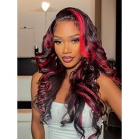 13x4 Transparent Lace Front Straight / Loose Wave Wig Dark Burgundy With Rose Red Highlights 150% Density
