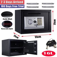 UK STOCK!FAST&FREE SHIPPING!5 YEARS WARRANTY!MONEY BACK GUARANTEE! Item specifics: Occasion: HOME OFFICE HOTEL Material: Solid Steel Sizes: 16L Color: Black Lock Type: Digital/Keys Fixture Type: Surface Mounted Operation: Digital PIN or Override Key Type: Safes Battery Required: 4 x AA-Size 1.5V (provide for oneself) Sub-Type: Electronic Digital Safe OR Key Time Out Period: After 3 attempts Product Description: ★Opens with digital PIN or included override key ★Hidden lock with one key ★Security code from 3-8 digits using any number from 0-9 ★Time out period after 3 incorrect combination attempts ★Constructed with 2mm Thick Solid Steel ★4mm Thick Front Door for More Security ★Pre-drilled holes behind the safe with included 125px bolts for anchoring ★Inside tamper-proof hinges ★Carpet padding on inside bottom ★Mounting to the floor, wall or cabinet Note:the 16L Safe Box has 4 anchor bolts and has 2 compartments Package includes: 2 x Keys 1 x Safe Box 1 x Velvet cushion 4 x Bolts 1 x