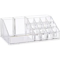 This cosmetics organiser has three small drawers at one side for smaller items, and one larger drawer which is ideal for stowing away bulkier objects. On top, eight separate compartments allow for vertical storage, ideal for lipsticks and brushes. This cosmetics organiser is perfect for keeping make-up stored and organised. Features Keeping beauty products in one place is simple thanks to this eight compartment and four drawer cosmetics organiser. This cosmetics organiser has three small drawers at one side for smaller items, and one larger drawer which is ideal for stowing away bulkier objects. On top, eight separate compartments allow for vertical storage, ideal for lipsticks and brushes This cosmetics organiser is perfect for keeping make-up stored and organised. Registered and Approved Distributor Colour: Clear Weight and Dimensions Product Dimensions: W24 x D15 x H19cm Product Weight (KG): 1.2