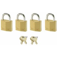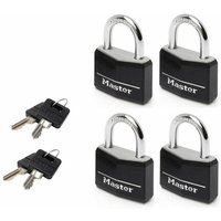 The Master Lock 9120EURQBLKNOP has the following specifications: 4 x 20mm aluminium padlocks with black vinyl cover - 11mm steel shackle, 3mm diameter - 3-pins - keyed alike