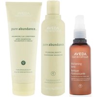 Transform limp locks with the Aveda Pure Abundance Shampoo, Conditioner and Thickening Tonic Trio, a gift set that’s bursting with body-boosting ingredients and uplifting scents. The shampoo, conditioner and thickening tonic work together to add volume and vitality to every strand.The Set Contains:Pure Abundance Volumizing Shampoo (250ml)Add fullness and definition to fine hair with a nourishing shampoo that uses a natural, plant-based formula. Kaolin Clay and Acacia Gum combine to boost body and volume, while Jasmine and Peppermint provide an uplifting scent that lasts throughout the day.Pure Abundance Volumizing Clay Conditioner (200ml)Harness the power of Kaolin Clay to thicken, volumise and boost hair from root to tip. Also containing nourishing Acacia Gum from Africa, the conditioner softens and strengthens strands to add body and life.Thickening Tonic (100ml)Transform limp, lifeless locks with a powerful treatment that works to boost volume from root to tip. Packed with botanical ingredients including certified organic Amla Fruit, its 97% naturally derived formula is ideal for thinning and damaged hair, allowing you to achieve a fuller, denser appearance after just one use.