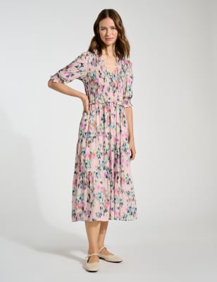 Step out in cheerful polka dots with this tiered dress by BAUKJEN. It's cut to an effortless relaxed fit from smooth satin fabric, with a crew-necked bodice and short puff sleeves. This charming midi also features pockets for a casual touch.