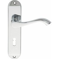 Carlisle Brass Andros Door Lock Lever Handle on Long Backplate Polished Chrome provides a classy neat finish with it's curved sweeping lever on a rounded backplate that is elegant with a discreet fixing. Euro and lock profile. Supplied & sold in pairs complete with fixings. 10 year mechanical warranty. Backplate size: 240 x 40mm.