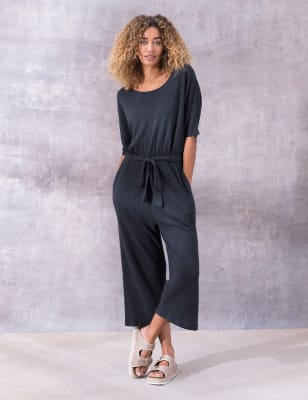 This linen and cotton jumpsuit from Celtic & Co will quickly become a weekend favourite. It features a neat round neck, a button-through bodice and a comfy elasticated waist with a tie fastening for an adjustable fit. A micro-check pattern creates added texture. Pockets at the hips, back and chest provide room for essentials, while turn-up cuffs on the short sleeves give a laid-back feel.