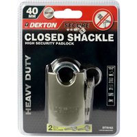 Dekton 60mm Closed Shackle Padlock Ideal for outdoor use. Designed to expose as little of the shackle as possible, making it more difficult to attack with bolt cutters and saws. Suitable for securing residential/commercial property. Hardened steel shackle, providing an excellent level of security. Includes 2 keys. Approximate Dimensions: Body width 60mm Overall length 90mm