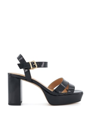 These leather sandals from Dune London are equal parts smart and comfortable. The open-toed design features a buckled ankle strap for a secure fit, with metallic branded detailing that adds a sophisticated touch. A mid-height block heel with a traditional wood-effect finish completes the versatile style.