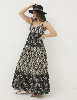 Create an eye-catching effect in this FatFace dress with its placement floral print. It's cut in a regular fit, with a tie belt to enhance the waisted silhouette. The sleeveless bodice features a frill detail which can be worn for an off-the-shoulder look or as shoulder straps. Flowing to an elegant midi length, the gathered skirt is complete with pockets.