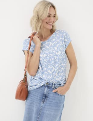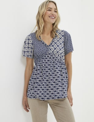 Made with a bold geometric print, this FatFace blouse lends extra flair to smart-casual ensembles. It's cut to a comfy regular fit, with front button fastenings for a neat look and a flattering v-neckline. The short sleeves are shirred at the cuffs to create an on-trend puff silhouette.