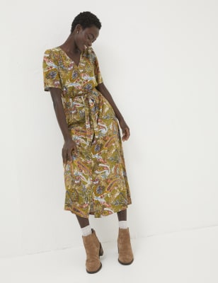 With its dreamy print of paisley swirls, this FatFace dress is sure to stand out. It's cut to a comfy regular fit, to a skater silhouette that fits neatly in the bodice and flares out through the skirt. A square neckline and three-quarter sleeves add a feminine feel, while gathers at the waist lend fullness to the midi-length hemline.