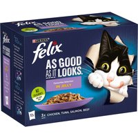 Felix As Good As It Looks is made with tasty, tender chunks of meat in a delicious jelly and is packed with irresistible flavours and tempting textures that we're sure your cat will love! This wet cat food tastes and smells very appetising and it looks as if you have prepared it yourself. The innovative recipes make it an irresistible taste experience for your cat. In these delicious variety packs your cat can choose from the mouth-watering meat and fish recipes including beef, chicken, salmon, tuna, turkey, lamb and more and enjoy a different recipe at every meal. We're sure your cat will love our carefully cooked dishes and as they're available in individual pouches, mealtime is even more convenient than before! Felix contains everything your pet needs to stay healthy and active. Only the best, quality-controlled ingredients go into Felix As Good As It Looks. Felix As Good As It Looks Pouches at a glance: Mouth-watering tastes and textures, it really does taste as good as it looks! Packed with essential vitamins and minerals A great way to keep your cat nourished through complete and balanced nutrition Delicious flavours including beef, chicken, salmon, tuna, turkey and lamb Mixed Favourites Selection: Chicken in Jelly Beef in Jelly Salmon in Jelly Tuna in Jelly Doubly Delicious Selection: Beef and Poultry in Jelly Chicken and Kidney in Jelly Lamb and Chicken in Jelly Turkey and Liver in Jelly
