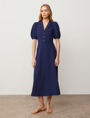 With its crisp polka dot print, this waisted midi dress from Finery London is a playful choice for daywear. It's cut in a comfy regular fit, with a flattering v-neckline and gathers under the bust to give extra shaping. The three-quarter sleeves are gathered at the shoulders for a touch of fullness, while the button-through fastening adds neat detail.