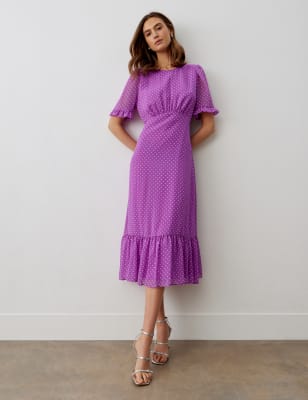 Go for an eye-catching look with this vibrantly printed midi dress from Finery London. It's designed in a regular fit, with long sleeves and a v-neckline, accented with a slightly raised collar for a smart air. An elasticated waist makes it both comfortable and flattering. This piece is complete with elegant covered buttons on the front.