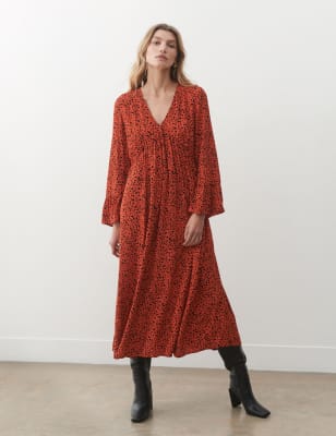 Choose an eye-catching look with this Finery London dress, decorated all over with a striking print. It's made in a comfy regular fit, with a smart collared v-neckline and a button-through bodice. A slim self-tie belt creates a flattering waisted silhouette. The long sleeves gather into buttoned cuffs, lending gentle volume.