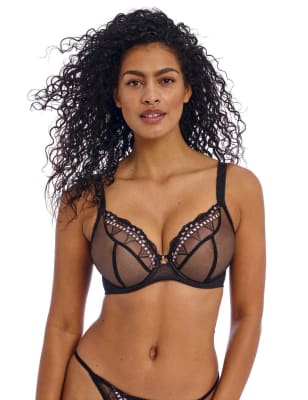 The luxurious Fatale bra from Freya is designed for fuller busts. It's non-padded, with decorative checked cups that feature a sheer upper and a delicate lace trim. The underwired plunge design helps lift and support while creating a flattering shape. A metallic ring details the centre front, and the adjustable straps are cleverly designed to prevent slippage.