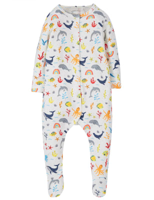 Keep baby feeling comfy and looking cute in these Frugi bodysuits. They're made from breathable pure cotton to a regular fit with short sleeves. For easy changes, they feature envelope folds on the shoulders and a popper-fastening gusset. The handy pack of two includes one striped design, and the other with a fun sealife print.