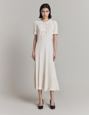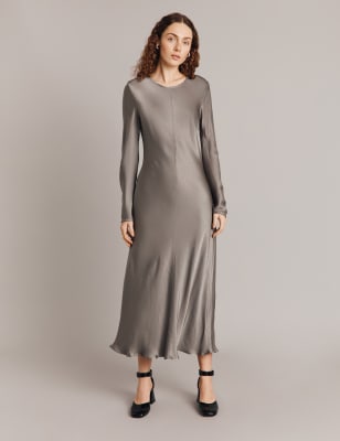 This column dress from Ghost is crafted from satin-back crepe fabric for an elegant drape. Cut in a regular fit, it has a round neckline featuring on-trend cut-out detailing with ring hardware. Loosely fitted long sleeves provide a feminine touch. A keyhole detail at the back and a midaxi hem enhance the graceful silhouette.