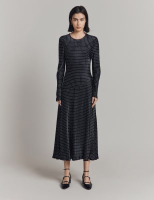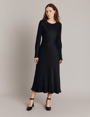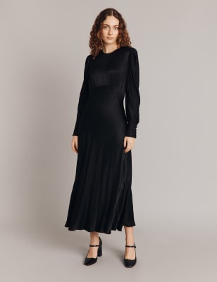 This waisted dress from Ghost is cut from flowing satin with a luxurious sheen. It's made to a regular fit, and features short angel sleeves that give fluttery movement. Below the flattering v-neckline, an underbust seam creates extra shaping through the bodice. Covered button fastenings add understated detail, while the hemline sits at an elegant midi length.