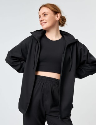 This cropped sports jacket from Girlfriend Collective is a practical addition to your casual wardrobe. It's designed in a comfy relaxed fit, with a stylish half-zip neckline. The boxy shape is enhanced with a cinchable waist. A pack-away hood and water-resistant fabric help keep you dry in wet weather. To finish, the functional kangaroo pocket has zip fastenings to keep your essentials secure.