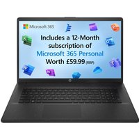 A 17.3-inch laptop with a big vision for the future. The HP 17 Laptop is thoughtfully designed and delivers performance with an Intel processor, fast Wi-Fi technology and loads of storage. Enjoy a more natural and comfortable typing position with the lift-hinge design and enlarged click pad. The HP 17 design includes sustainable materials like ocean-bound plastic and post-consumer recycled plastic. Reliable, powerful processor. Multitasking feels easy and fast with the performance of an Intel processor. Get a 1-year subscription to Microsoft 365 Personal (formerly Office) included in the price of this laptop, giving you access to the latest versions of Word, Excel & PowerPoint, plus 1TB of OneDrive cloud storage. General features: Suitable for working from home. Size H2.06, W40.07, D25.78cm. Weight 2.05kg. CPU, Memory and Operating System: Intel Pentium N5030 processor. Quad-core processor. 1.1GHz processor speed with a burst speed of 3.1GHz. 4GB RAM DDR4. 128GB SSD storage. Operating System: Windows 11 in S-mode (Pre-Installed). Display features: 17.3 inch screen. Resolution 1920 x 1080 pixels. Screen Type: IPS. Brightness (Nits): 250. Anti-Glare Screen. Graphics: Intel UHD Graphics 605 graphics card. Shared graphics card. Interfaces and connectivity: 1 USB Type-C port. 2 USB Type-A ports. HDMI port HDMI port// HDMI ports. Headphones jack. Bluetooth. Wi-Fi enabled. Multimedia features: HD webcam. Built-in mic. Built-in audio sound system. Software included: Alexa, ExpressVPN (30-day free trial), LastPass Premium (30-day free trial). 1 year. Microsoft 365 Personal. 30-day trial McAfee LiveSafe. General information: Box Contents: Laptop; Battery, AC adapter; Power cord. Manufacturer's 1-year guarantee. Model number: 17-CN0104NA. Part number: 894M3EA. EAN: 0196188226520.