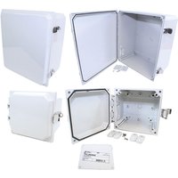 IP66 Type 4X Polycarbonate Junction Box Hinged Lid Snap Latch & Inner Panel - Hammond PCJ1084L, The Hammond PCJ Series Polycarbonate Junction Box is designed to provide insulation and protection for controls and components for use in both indoor and outdoor conditions. The Enclosure is watertight to IEC 60529, IP66 with a flammability rating of UL94,V-0.Ideal for use with industrial pump controls, waste water, irrigation, solar/wind and chemical plant controls.The injection moulded polycarbonate thermoplastic enclosure with matching door, can be easily punched, cut, or drilled. It comes in a light grey finish and features enhanced UV inhibitors to protect against outdoor weathering. The door is secured with Snap Latch door fasteners, which include provision for the addition of a padlock, if required. A captive, oil resistant gasket provides a seal when the door is closed. Threaded brass inserts are provided on the inside rear of the enclosure, to enable fitting of an optional internal mounting panel or terminal kit mounting. Multi-directional mounting of the enclosure is possible, using the Polycarbonate foot mount brackets provided.Mounting hardware is included. Optional inner panels are available in a white powder coated steel finish. Hammond PCJ1084L IP66 Type 4X Polycarbonate Junction Box Hinged Lid Snap Latch