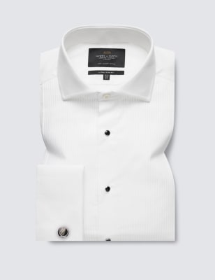 Look the part at special occasions with this pure cotton evening shirt from Hawes & Curtis. It's designed in a tailored classic fit, with a semi-cutaway collar and double cuffs. The waffle-textured bib, cufflinks or bowtie and contrasting buttons add refined touches. This smart style is complete with an easy-iron finish for quick laundering.
