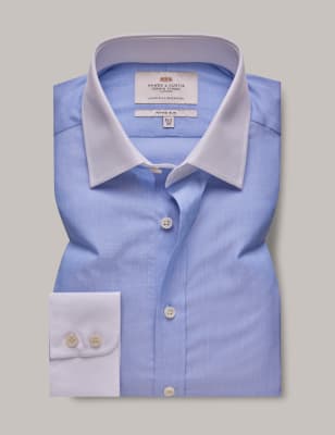 Opt for a refined look on smarter occasions with this pure cotton shirt from Hawes & Curtis. It's designed in a modern slim fit, with a semi-cutaway collar, tie and rounded two-button cuffs for a tailored aesthetic. The Bengal stripe adds authentic style to this long-sleeved piece, while the non-iron finish makes for hassle-free laundering.