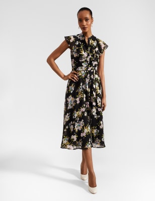 This charming floral print dress from Hobbs is crafted from soft jersey fabric that drapes effortlessly over the body. It's made to a regular fit, with a v-neck and a shirred panel that draws in the waist for a flattering silhouette. Shirred cuffs create gentle volume through the long sleeves, while the skirt falls to a versatile midi length.