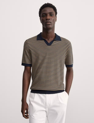Jaeger Men's Merino Wool Rich Knitted Polo Shirt with Silk - SREG - Navy, Navy,Sand