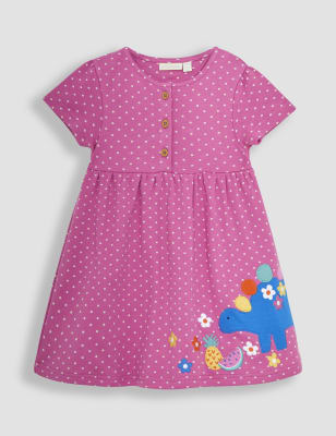 This roarsome dress from JoJo Maman Bébé is bursting with bright and colourful dinosaurs. It's made to a regular fit, with a neat row of buttons and a swishy full skirt. An applique dino sits in the pocket, ready for all their playtime adventures. This short-sleeved piece is made from breathable pure cotton.