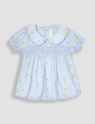 This daisy print dress by JoJo Maman Bébé is perfect for warm weather days. It's made in a comfy regular fit from pure cotton fabric, with a round neck and airy short sleeves. Button-through fastenings on the top add a neat touch to this playful design, which is finished with two matching patch pockets on the skirt.