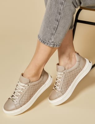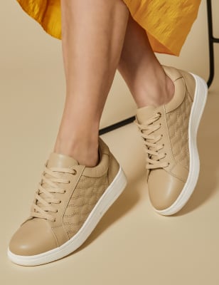 These leather trainers from Jones Bootmaker have a chunky platform sole for a bouncy feel. The soft leather upper has a distinctive quilted design, with plain panels at the heel and toe for contrast. Their matching laces are threaded through smart metallic eyelets. These are complemented by the metallic detail on the bottom lace, which reads 1857 - the year Jones' first shop opened. Padded ankle collars add extra comfort.