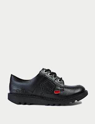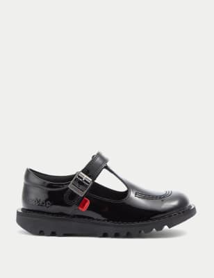 These premium leather school shoes from Kickers are a classic choice for busy feet. They're made in a timeless T-bar style, with a riptape fastening for easy on and off. The shoes feature the brand's iconic triple stitching and ridged rubber soles for extra durability. The green and red tabs add a fun finish.