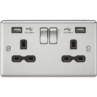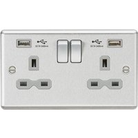 This charger socket is a great finishing touch to any modern home. Decorative rounded edge metal design with matching metal rockers. Built in Dual USB Charger - 13A Switched socket - Dual USB Charging 5V DC2.4A (shared) - Decorative round edge design with built in gasket - Certified to BS1363-2:2016, EN 62368-1, EN 62680-1-1, EMC and ErP Certified - Minimum mounting box depth 25-35mm* *dependent on wiring conditions WE RECOMMEND YOU ALWAYS USE CERTIFIED USB CABLES FOR SAFETY AND TO ENSURE COMPATIBILITYTechnical Specification:Projection (mm): 7.5Min. Mounting Box Depth (mm): 25-35mm (dependent on wiring conditions)Construction: Premium grade steelFinish: Brushed ChromeClass: IIP Rating: IP20Primary Voltage: 230V 50HzEarth Terminal: YesDimensions: Height: 86mmWeight: 0.269KgWarranty: 2 Years