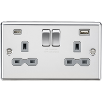 This charger socket is a great finishing touch to any modern home. Decorative square edge metal design with matching metal rockers. Built in dual USB Charger with both legacy USB-A port and the latest USB-C port 13A 2G Switched socketDual USB C+A 5V DC 4.0A [shared]Decorative square edge design with built in gasketMinimum mounting box depth 25-35mm**dependent on wiring conditionsWE RECOMMEND YOU ALWAYS USE CERTIFIED USB CABLES FOR SAFETY AND TO ENSURE COMPATIBILITYTechnical SpecificationHeight: 85.75Width: 146.5Projection: 7.5Min. Mounting Box Depth: 25-35mm (dependent on wiring conditions)Construction: Premium grade steelFinish: Polished ChromeClass: IIP Rating: IP20Primary Voltage: 230V 50HzEarth Terminal: YesTechnical Specification:IP Rating: IP20 Colour: Polished ChromeDimensions: Height: 86mmWeight: 0.269KgWarranty: 2 Years