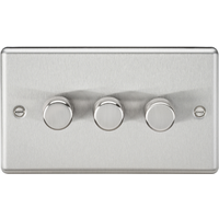 Perfect finishing touch to any modern home, rounded edge metal design with matching metal cap 10-200W incandescent10-150W mains voltage halogen10-150W LV halogen with electronic transformer5-150W LED dimmable lamp2-wayPush on/offRotary action dimmerAnti-FlickerTrimming functionSwitchable from Trailing Edge to Leading EdgeOverload and Over Temperature protectionInrush Current Limiter (ICL)NB: PLEASE CHECK WITH LAMP MANUFACTURER FOR COMPATIBILITYTechnical SpecificationHeight: 85.75Width: 85.75Projection: 7.5Min. Mounting Box Depth: 25mmConstruction: Premium grade steelFinish: Brushed ChromeClass: IIP Rating: IP20Primary Voltage: 230V 50HzEarth Terminal: YesTerminal: ScrewTechnical Specification:IP Rating: IP20 Colour: Brushed ChromeDimensions: Height: 86mmWeight: 0.135KgWarranty: 2 Years