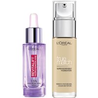 Create a dewy, glowing complexion with the L’Oreal Paris Hyaluronic Acid Filler Serum and True Match Hyaluronic Acid Foundation Duo. Hyaluronic Acid acts as a humectant to draw moisture to the skin.Set Contents:Hyaluronic Acid Filler Serum 30mlPlump and replenish your complexion with this intensive serum. Formulated with 1.5% Hyaluronic Acid, the hydrating formula works to deeply moisturise the skin, reducing the appearance of lines and wrinkles.True Match Hyaluronic Acid Foundation 30mlThis lightweight, hydrating formula is infused with a host of skin-loving ingredients such as Hyaluronic Acid, Glycerin and Aloe Vera extract, along with vitamin B2 and provitamin B5. Providing a natural-looking, luminous finish the foundation features SPF17, helping to defend against the effects of both UV rays and pollution.