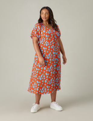 This Live Unlimited London tea dress is crafted from lightweight fabric featuring a cheerful floral print. It's cut in a regular fit, with a cute tie detail on the v-neckline. The elasticated waist lends a comfortable feel, while the short angel sleeves enhance the feminine look.