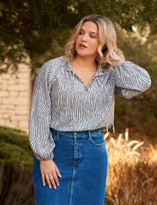 With its wavy polka dot print and soft fabric, this lightweight blouse from Live Unlimited London will slot seamlessly into your smart-casual wardrobe. It's designed in a flattering relaxed fit, with a Nehru collar that leads to a feminine v-neckline. Pleat detailing at the front offers extra movement, while elasticated cuffs on the long sleeves create elegant volume. This piece fastens with delicate covered buttons.