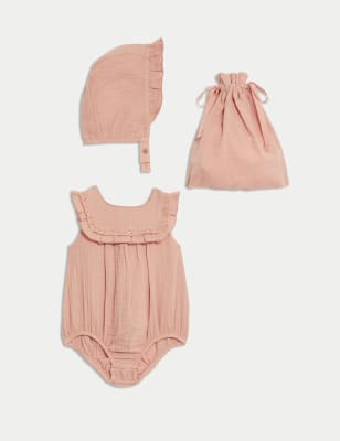 M&S 2pc Pure Cotton Bear Romper (7lbs-1 Yrs) - NB - Dark Almond, Dark Almond