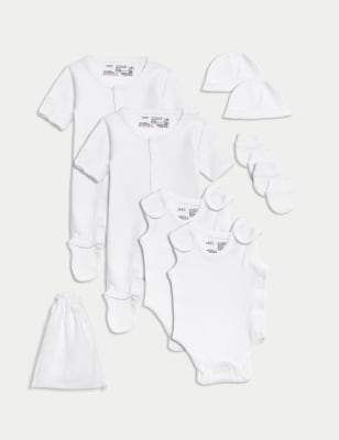 Made from soft cotton, this eight-piece set is the perfect gift for newborns, including premature babies. It features two sleepsuits, two bodysuits, two hats and two pairs of mittens. Flat seams and printed back neck labels give comfort against their delicate skin. Riptape fastenings make for simple changing. Plus, the sleepsuits have an opening in the feet for easy access. Everything comes in a handy drawstring bag.