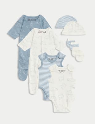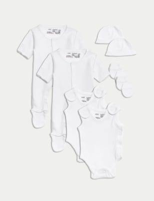 This pure cotton starter set is a practical choice to welcome your premature baby to the world. The eight-piece selection includes two popper-fastened sleepsuits with integral feet that have easy-opening access. Meanwhile, the two vests are made with snaps at the shoulders and legs, plus riptape fastenings at the side, for easier dressing. Two pairs of mitts help prevent scratcing, while the two knotted hats keep your little one warm. Flat seams and soft printed labels feel gentle on delicate skin.