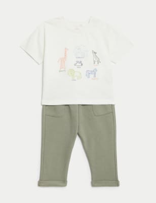 M&S Boys 2pc Cotton Rich Outfit (0-3 Yrs) - 0-3 M - Green, Green,Charcoal,Blue,Brown