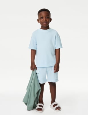 This pure cotton outfit is perfect for playtime. Two-piece set includes a long-sleeved top and a pair of shorts which come in a handy bag. The top features a wrap-over bow fastening, while the shorts are complete with an elasticated waist and legs for easy changing.