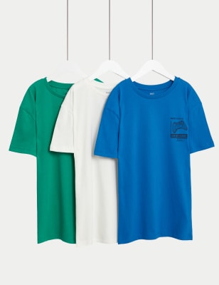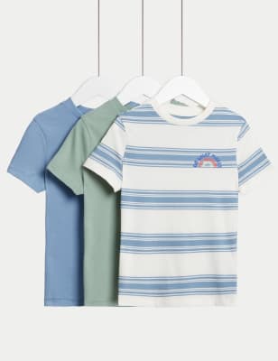 M&S Boys 3pk Cotton Rich Plain & Striped T-Shirts (6-16 Yrs) - 7-8 Y - Blue Mix, Blue Mix