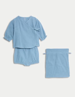 This four-piece pure cotton outfit makes a great gift for new arrivals. Includes a short-sleeved bodysuit and romper with popper fastenings along with a handy dribble bib and hat. Cute bear and elephant embroidery features throughout. Flat seams give ultimate comfort.