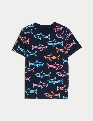 These cotton-rich shorts are perfect for active days at the beach or by the pool. Comfy regular fit with an elasticated waist and drawstring fastening for comfort. The all-over pattern shows sharks printed in bright neon colours.