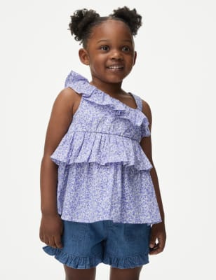 Add a playful touch to their casual wardrobe with this pure cotton t-shirt. Regular fit, with a round neck and breezy short sleeves. Featuring a choice of prints, including a rainbow and a heart design. A frill on the sleeves provides a charming finish.