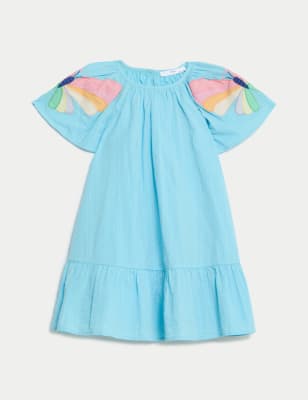 M&S Girls Pure Cotton Striped Flamingo Dress (2-8 Yrs) – 3-4 Y – Turquoise, Turquoise