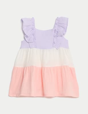 This adorable pure cotton dress is perfect for sunny days. It's made to an easy regular fit, with pretty frilled short sleeves and a swishy tiered hem. The rainbow stripes provide a bright and fun feel, and the dress is complete with a button fastening on the back.