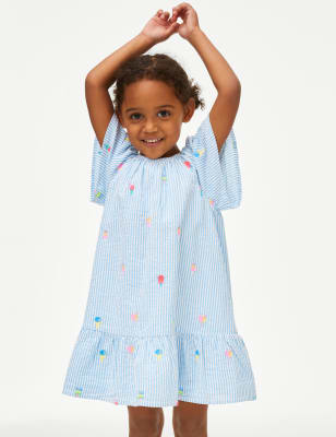 Crafted from breathable pure cotton fabric, these shorts are a practical addition to your youngster's summer wardrobe. Regular fit, with an elasticated waist for comfort and a neat drawstring tie. Striped seersucker material creates a textured look, while frilled trims at the legs add fluttery detail. At the hips, pockets provide handy storage.